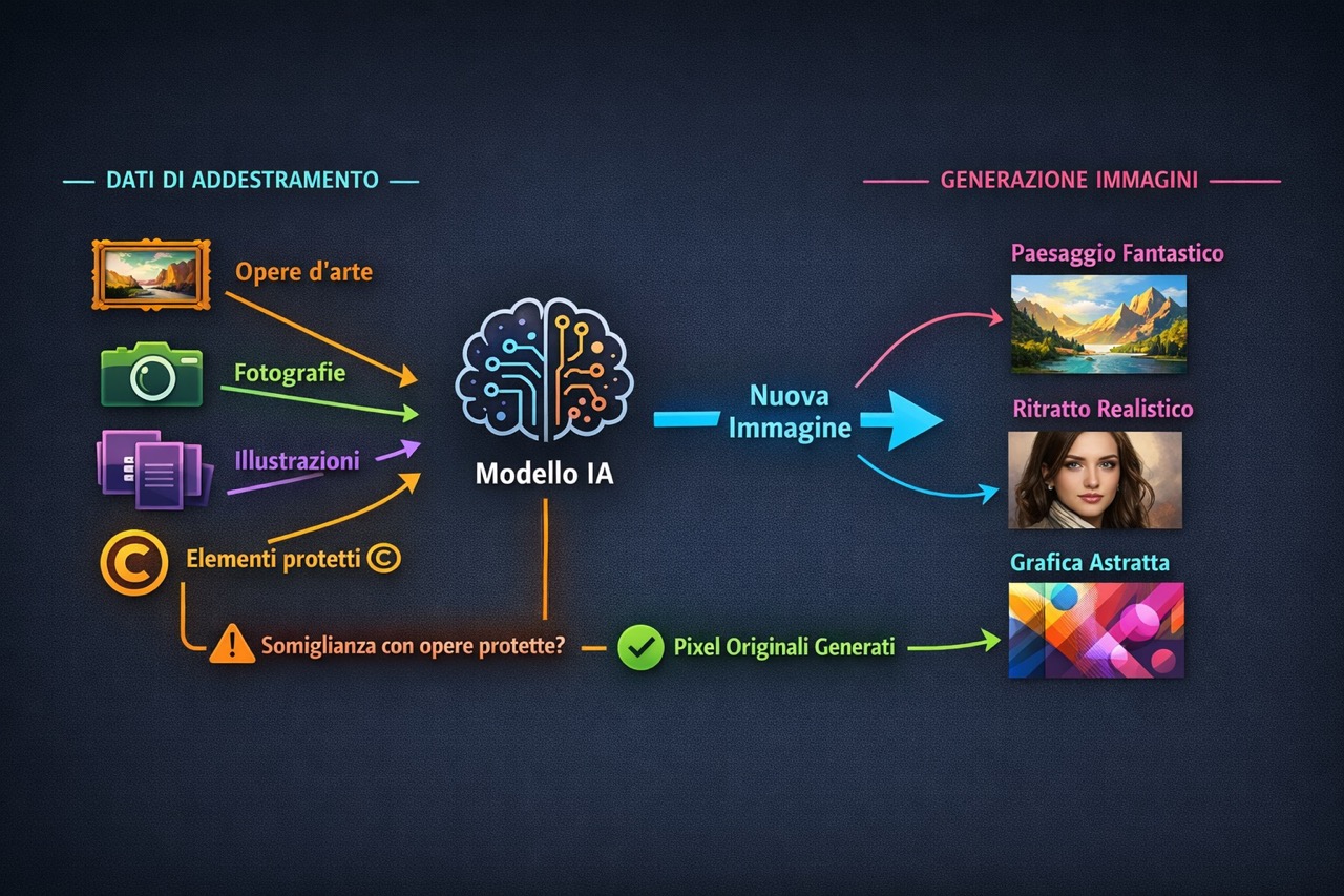 Per capire il tema immagini generate da intelligenza artificiale copyright conviene partire da una base: l’IA non “scarica” un’immagine da internet e non crea un collage automatico (almeno non nel senso comune del termine).
